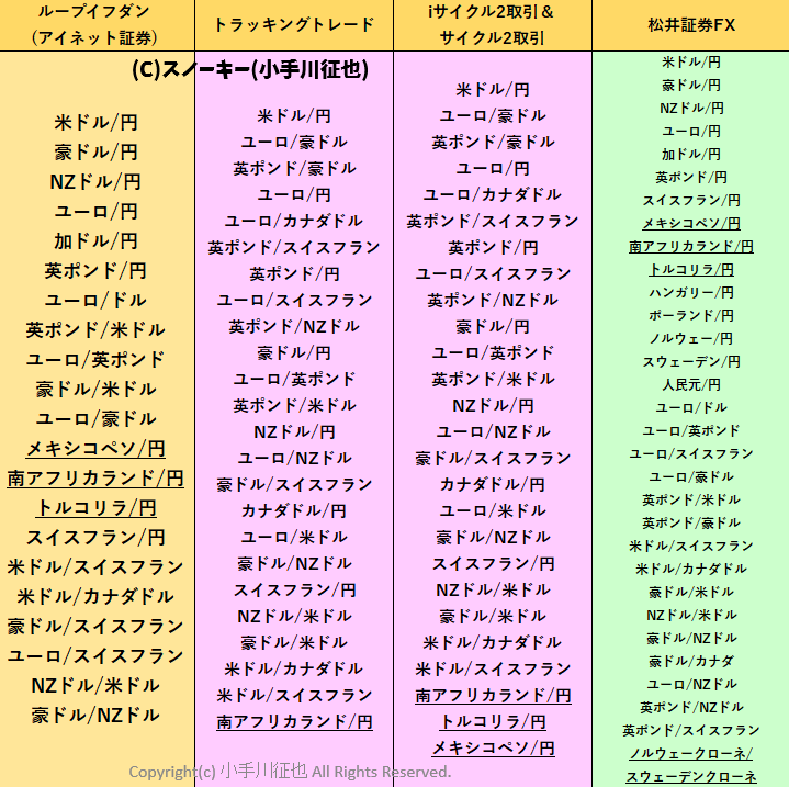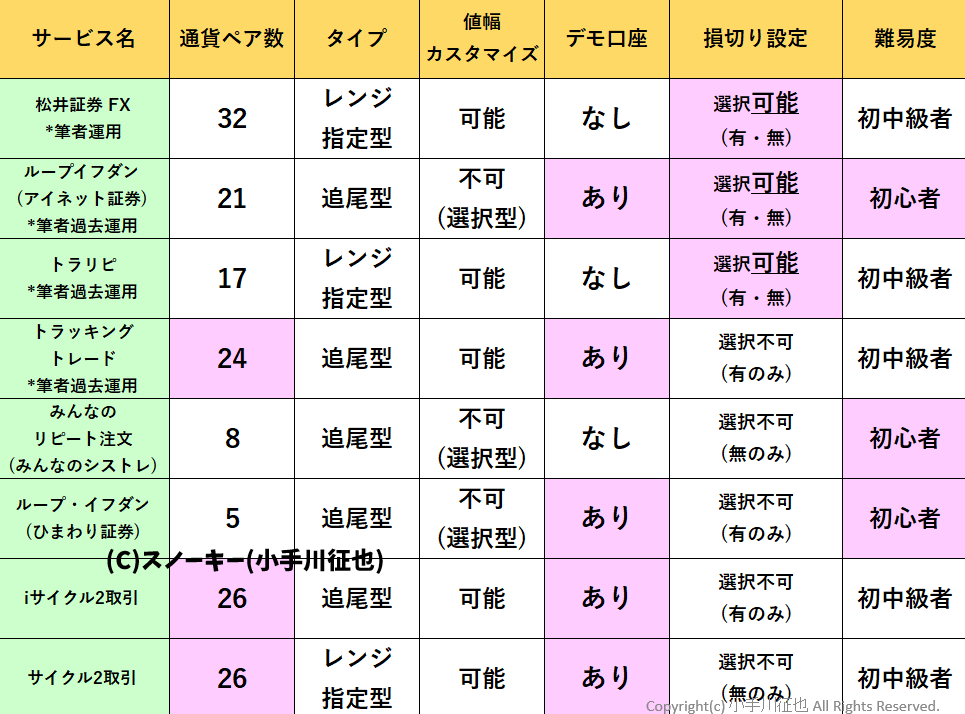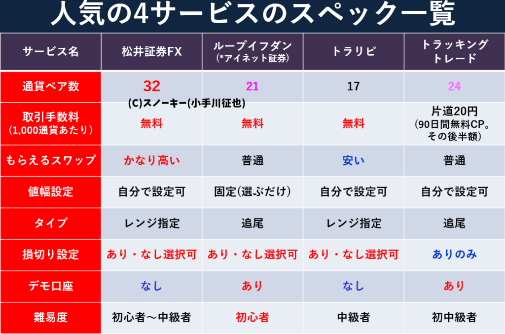 | 通貨ペア/サービス名 | 松井証券 | ループイフダン | トラッキングトレード | トラリピ |
