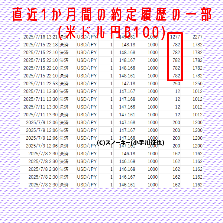 直近約1か月間の米ドル円B100の約定履歴