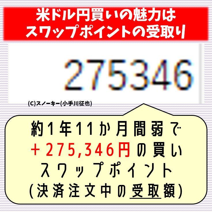 なんと、27万5,346円もの買いスワップポイント(決済注文中の受取額)を受け取りました。